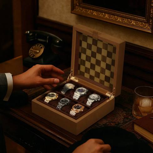 A hand-lacquered checkered wood inlay and gold-plated hinges add depth and distinction, making every box one of a kind.